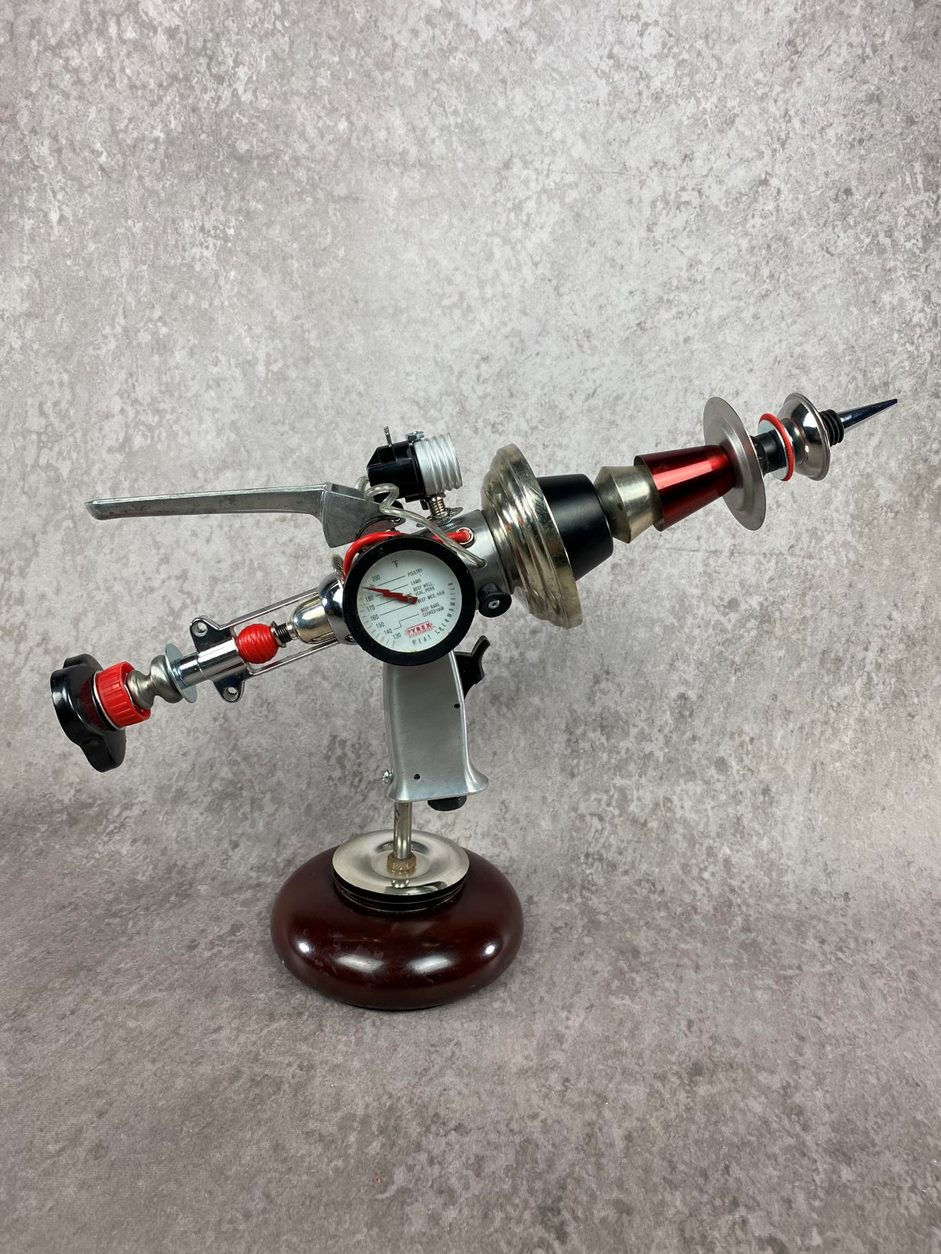 "It takes a very special type of person to acknowledge and appreciate the craftsmanship and beauty of everyday, commonplace objects. It requires even more intuition and inventive creativity for a person to elevate those discarded or devalued items… to combine things that were never intended to be anything other than what they were designed to be… and create art with them. Working with various theater companies for the past 20+ years has earned me a unique appreciation for creating something from “nothing”. My love of disassembling and reassembling into something new grew from manifesting scenery and props for every imaginable (and unimaginable) setting and circumstance from a pile of lumber, cans of paint and an idea. For me, imagination is the purest art form. My Woah-Botz sculptures are created to manifest joy and excitement by incorporating recognizable, common and ordinary individual parts that have lived out their usefulness. In my process, I have adopted the motto of “Keep it out of the landfill and put it on the mantle” to illustrate my desire to use mostly found objects in all of my artwork. Creating something special and unique with each piece is important to me as an artist. With endless possible combinations of an endless variety of parts, no two of my sculptures are ever exactly the same. Each is an original. There are no reproductions. Just like people, there are only ever one-of-a-kinds!"